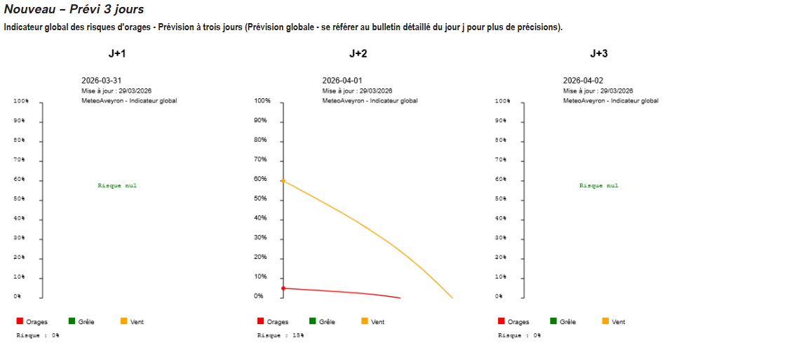 Un nouvel outil est désormais disponible dans la rubrique « prédiction des orages ». Il propose une tendance sur trois jours sous forme de graphique de probabilité d’orages, incluant également une indication du risque de grêle et de phénomènes venteux.