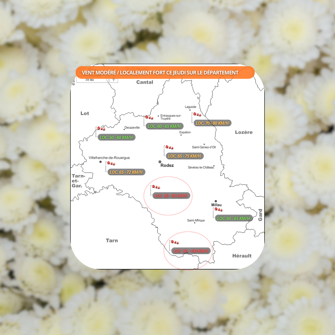 > Jeudi 05 Mars, les conditions seront globalement ensoleillées sur le département et de plus en plus nuageuses au fil de la journée (surtout en toute fin de journée). Quelques faibles averses ne seront pas exclus au sud Aveyron en fin de journée. [VENT] : Il soufflera localement fort sur les Monts du Réquistanais, Lévézou et Monts de Lacaune et modérément sur le reste du département.